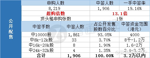 其中,公开配售申购人数8219,一手中签率19.16%,超购倍数13.1倍。