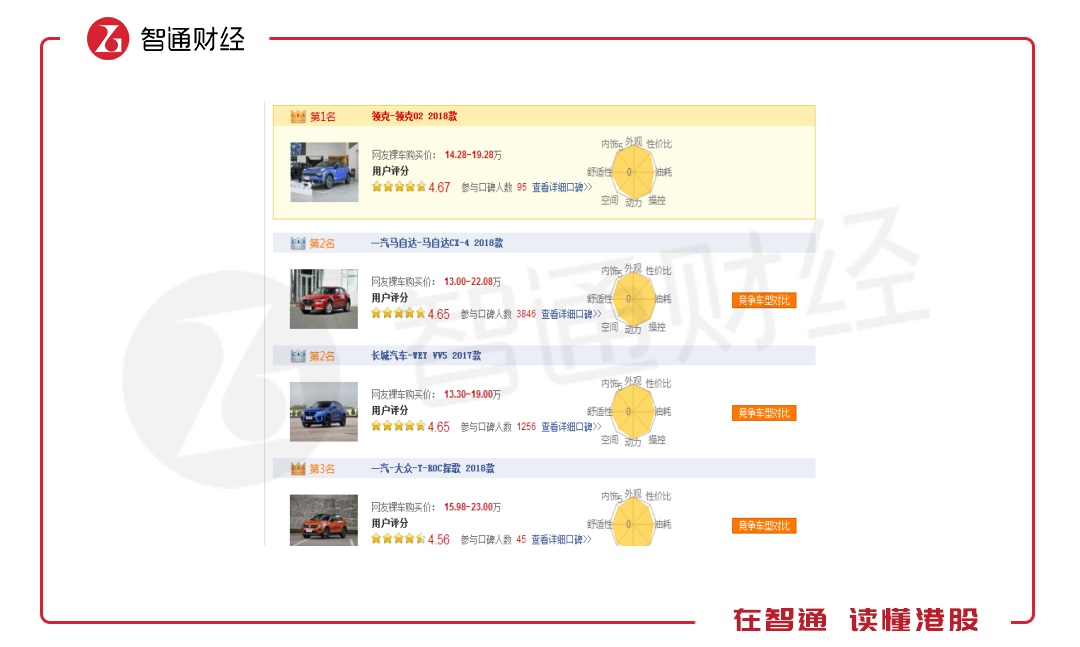 不过投资者可能认为仅限于深圳的实地考察,可能存在地域性的人气及认知水平,为了数据更加公正,笔者通过网络数据搜集了领克02的市场人气。汽车之家好车主之家为国内知名两大提供汽车销售的平台,笔者通过汽车之家了解到,领克02车型综合满意度排名第一名,在舒适度、外观及内饰方面人气均排第一。