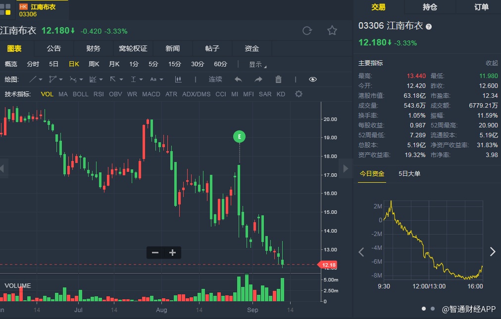 截至9月12日16:00,江南布衣跌3.33%,报12.18港元。