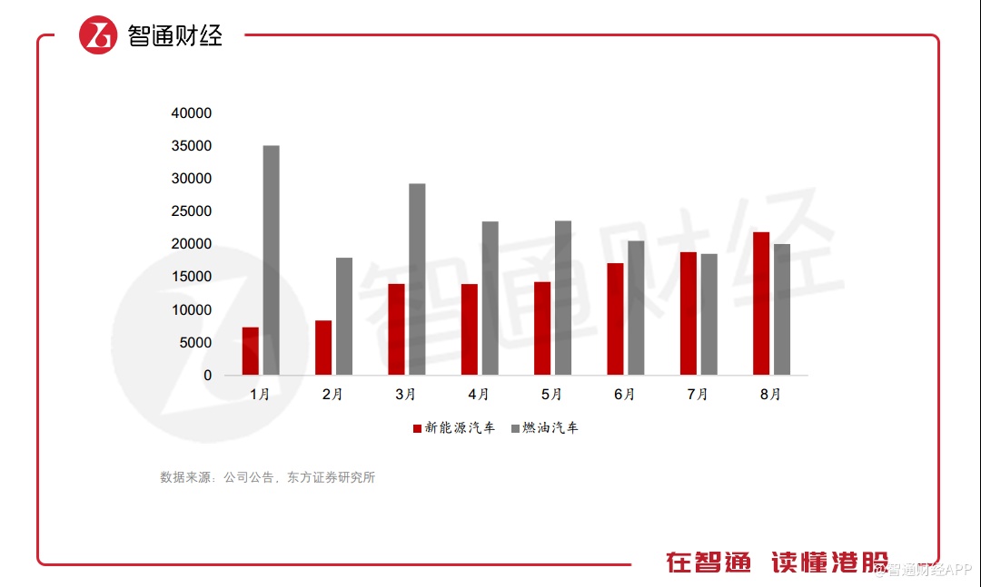 而且,智通财经APP还了解到,从2017年开始,国外一些国家相继发布了在2025年后停售燃油车的通知,据悉中国也将在2035年全面停售燃油车。这对于新能源汽车可谓天大的好消息。而相关车企的数据也印证了这一点,如比亚迪(01211)从7月份以来,新能源车的销量已经超过了传统燃油车(图1)。吉利汽车(00175)八月份销量报告也显示,新能源车销量达到10439,占总销量比例约8.3%,已经超过了积分标准。