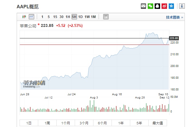 苹果股价周二收报223.85美元,升2.53%。截至发稿,周三股价盘前报224.81美元,升0.43%。