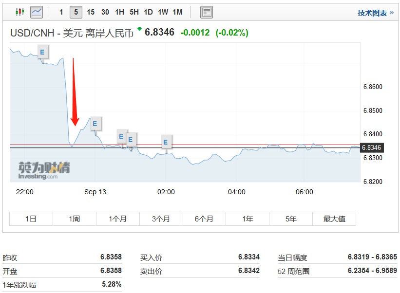 离岸人民币兑美元一度涨破6.83元,涨超470点,最高报6.8275。