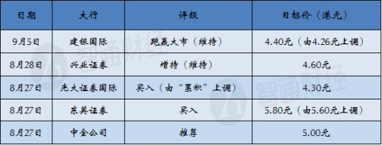 TCL电子(01070)中期业绩发布后受到广泛关注,各大行纷纷给予公司更高的评级及提升目标价。其中,建银国际认为公司股价跑赢大市,将目标价由4.26元上调至4.40元;东英证券在8月27日发表的研究报告中给予TCL电子买入评级,将目标价由5.60元上调至5.80元;光大证券国际评级由累积上调至买入。