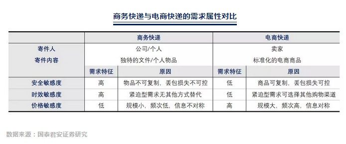 商务快递以服务品牌为无形资产,在高安全敏感、高时效敏感的需求面前,具有差异化的获客能力。同时,为满足安全和时效所投入的品牌成本、固定资产、运营冗余所带来的高成本,可以被低价格敏感度的需求所接受。