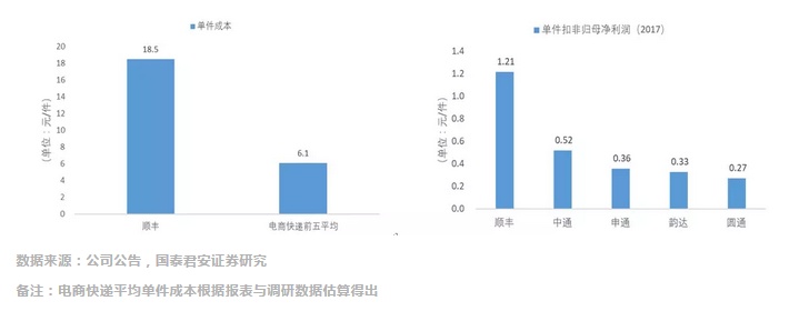 2. 成本利润:高成本的稳定服务创造了差异化的品牌,品牌带来较高的定价与单件利润。顺丰的单件成本是电商快递平均单件成本的3倍以上,但其单件扣非归母净利润也是电商快递企业的2-4倍。