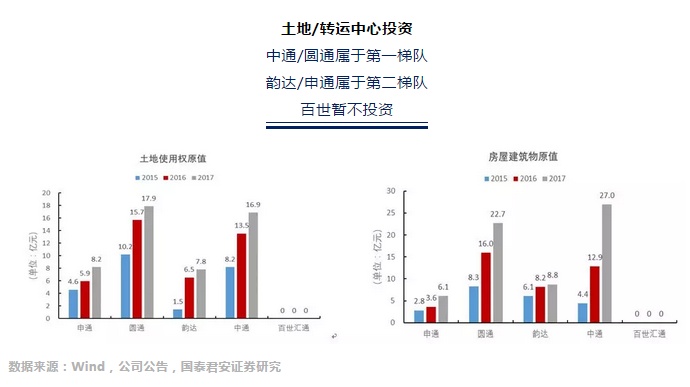各家企业过去数年投资侧重点的不同,也许是步骤选择上的差异,或者是业务逻辑判断的差异。总体来看,上市后的两年中,中通的投资力度全面领先,圆通重点投资土地与转运中心,韵达重点投车辆与自动化,申通重点投土地与车辆,百世重点投资自动化。