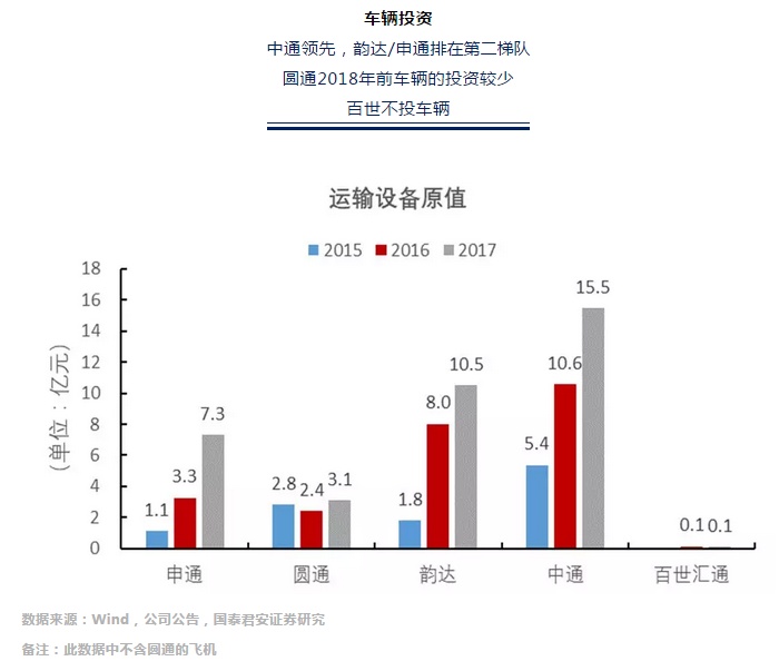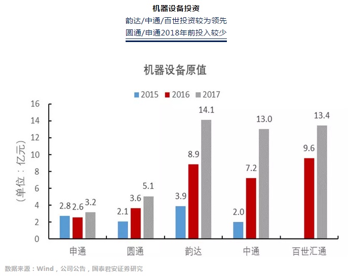 电商快递企业创立初期选择了在“轻资产、加盟制”模式,固定资产投资规模较小。2016年纷纷上市以来,我们观察到电商快递企业加大投资,“由轻变重”。