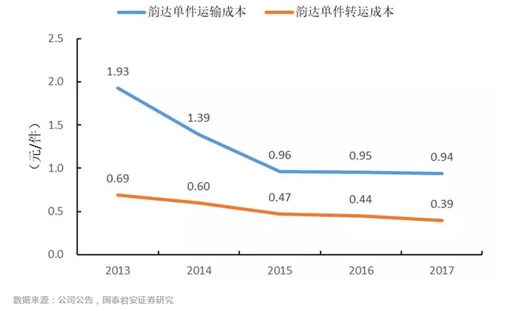 以韵达为例,2013年至2017年,业务量由11亿件增长至47亿件,单件干线运输成本由1.93元下降至0.94元,单件转运成本由0.69元下降至0.39元。
