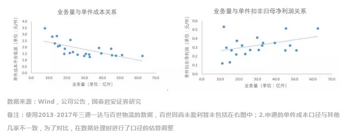 各家快递上市时间不长,我们利用有限的数据做出两张散点图:业务量规模与单件成本、单件利润的关系。