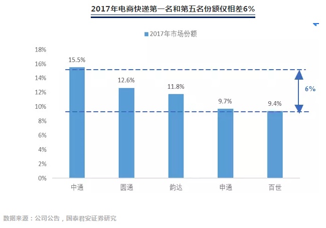 2017年,五大民营上市电商快递公司业务量占全行业(电商快递+商务快递)的60%。但五家公司中,第一名中通与第五名百世的市场份额相差仅6%。加上未上市的邮政与EMS,春秋六国确立。