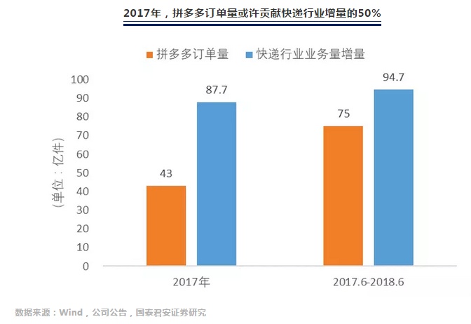 成立仅两年的2017年,拼多多订单量已占快递行业增量的50%。考虑到部分取消订单、平台间的互相渗透订单,50%大概有所高估,但毋庸置疑的是,拼多多为2017-18年的快递市场贡献了极为重要的增量。