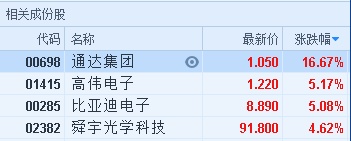 智通财经APP获悉,手机产业链全线上涨,通达集团(00698)核心业务增长强劲,领涨板块,截至14时39分,通达集团(00698)涨16.67%,报价1.05港元,高伟电子(01415)涨5.17%,报1.22港元,比亚迪电子(00285)涨5.08%,报8.89港元,舜宇光学(02382)涨4.62%,报91.8港元。