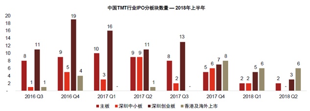据普华永道发布的数据,TMT企业在A股IPO的数量自2016年四季度达到峰之后,便一路下滑,而TMT企业赴港及海外上市的数量于去年第四季度激增,今年上半年更是超过了A股的三个板块。