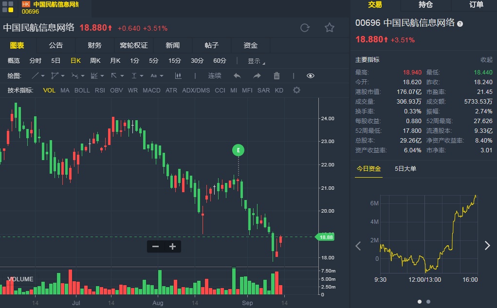截至9月13日16:00,中国民航信息网络涨3.51%,报18.88港元。