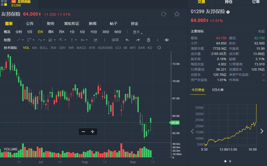 截至9月13日16:10,友邦保险涨1.91%,报64港元。