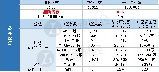 其中,公开配售申购人数1922,一手中签率100%,超购倍数0.5倍。