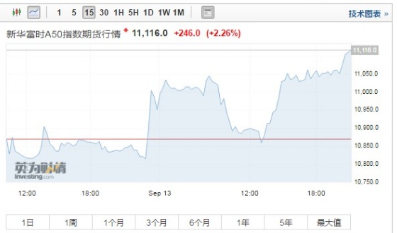 智通财经APP获悉,中美贸易摩擦迎来转机,9月13日晚间,外围市场走势向好。新华富时A50、恒指夜期大涨,美股指数期货全线上扬。截至发稿,新华富时A50报11116.0,涨246.0点,涨幅达2.26%