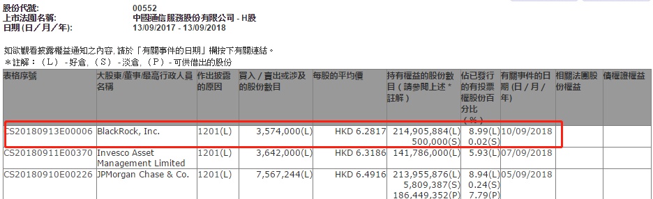 贝莱德减持中国通信服务(00552)357万股 每股作价6.28元