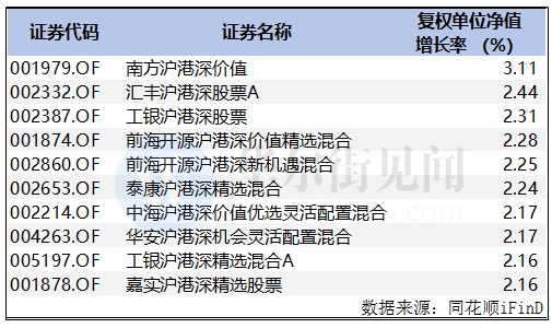 根据同花顺iFinD数据,开放式基金的基金全称中含有“沪港深”字样的基金,A、C份额以A类计,剔除未公布9月13日净值的部分定开基金,75只基金复权单位净值增长率的算术平均数为1.13%,其中仅1只增长率为负,南方沪港深价值13日复权单位净值增长率最高,达3.11%。