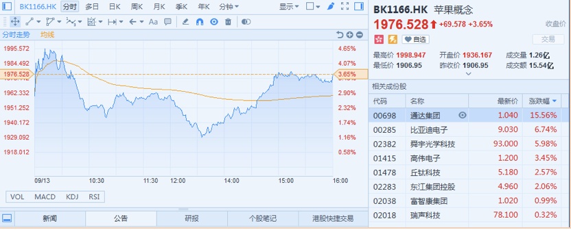但即便如此,港股的苹果概念股仍在9月13日全线大涨。其中,通达集团(00698)录得15.56%的最大涨幅,比亚迪电子(00285)、舜宇光学科技(02382)均涨超5%。