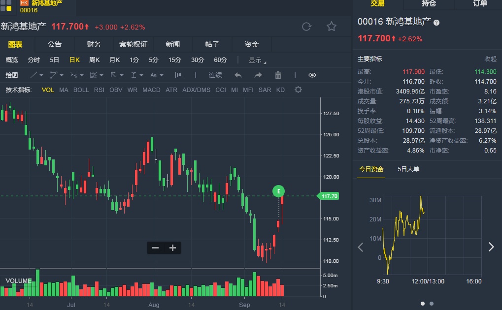 截至9月14日11:50,新鸿基地产涨2.62%,报117.7港元。