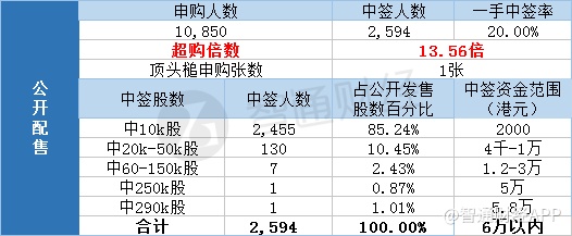 其中,公开配售申购人数10850,一手中签率20%,超购倍数13.56倍。