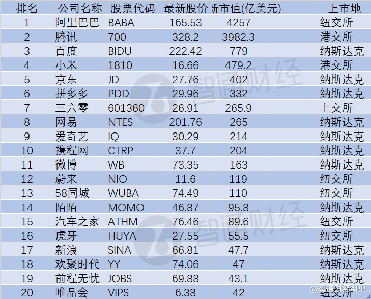 周四中概股普遍大涨,中国科技互联网公司市值排名也发生了变化。智通财经APP获悉,BAT仍稳坐前三名,小米和京东分列第四、第五位。