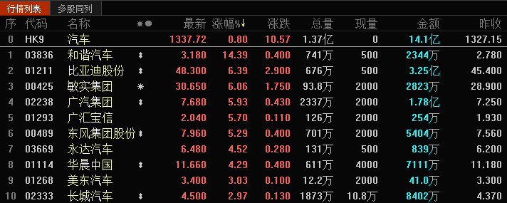 港股市场,早盘汽车板块全线上涨,尤其是和谐汽车(03836),一度涨到15%,由于盘面有波动,截图看更清晰: