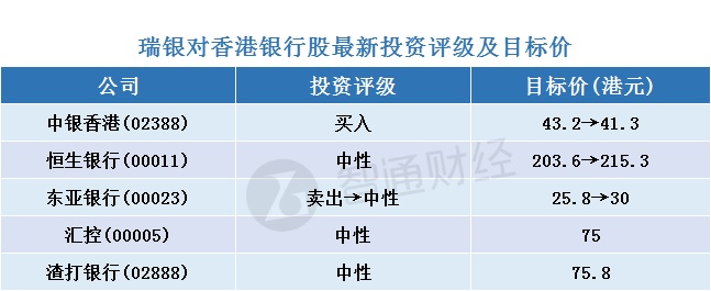 二、瑞银对香港银行股最新投资评级及目标价