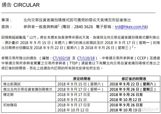 港交所表示,投资者识别码模式的最后测试将延期一周,由9月15日更改至9月22日;投资者识别码模式的推出日期,则由9月17日更改至9月26日。