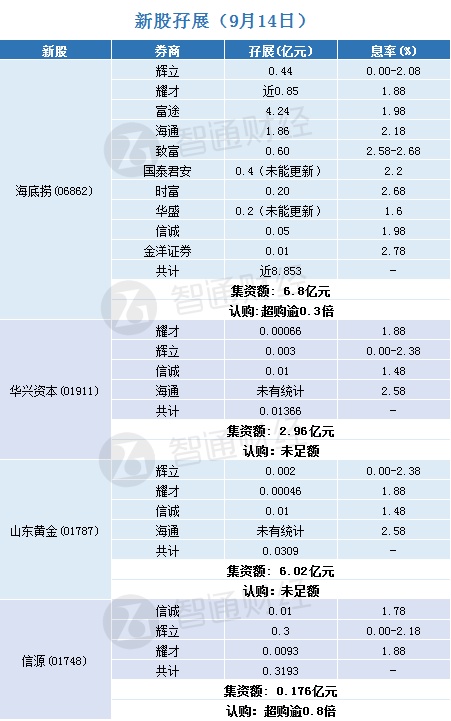 智通财经APP获悉,截至9月14日,海底捞(06862)正在招股中,富途、海通、耀才等10家券商总共为其借出8.853亿孖展金,超购逾0.3倍;华兴资本(01911)正在招股中,辉立、耀才和信诚等券商共计为其借出0.01366亿孖展金,未足额;信源(01748)正在招股中,辉立、信诚、耀才等券商总共为其借出0.3193亿孖展金,超购逾0.8倍;山东黄金(01787)正在招股中,辉立、耀才和信诚等券商共计为其借出0.0309亿孖展金,未足额。