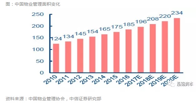 基础物业管理板块而言,房地产市场正逐步进入存量房时代,连续五年来新房竣工面积超过10亿平方米,为物业管理行业提供了广阔的发展空间。2008年至2017年中国物业管理面积平均增速为5%,2020年有望突破230亿平方米。在这样一个万亿规模空间的市场中,全国物管公司超过10万家,2017年行业前十强的市占率仅11.1%,对比之下,房地产开发商前十强的市场集中度达24%。未来,拥有优秀品牌且具备强扩张能力的龙头公司将会享受行业成长及市场份额加速扩大的双重成长红利。