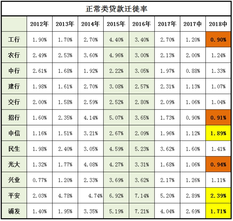 一、2018年上半年正常类贷款迁徙率情况。正常类贷款迁徙率这个指标是迁徙率中占到最重要的指标,如果把迁徙率这个指标看做一个整体,那么正常类贷款迁徙率重要性要占到60%,关注类贷款迁徙要占到30%,因为后面的迁徙会受到很多因素影响而价值不高。2018年上半年正常类贷款迁徙率最低的三家是工商银行、招商银行和光大银行,分别为0.9%、0.91%和0.94%。迁徙率最高的三家是平安银行、中信银行和浦发银行,分别为2.39%、1.89%和1.71%。
