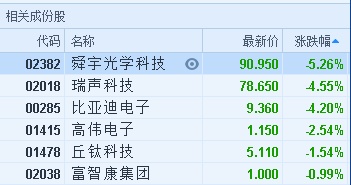 智通财经APP获悉,手机供应链早盘全线下挫,截至9时57分,舜宇光学(02382)跌5.26%,报价90.95港元,瑞声科技(02018)涨4.55%,报78.65港元,比亚迪电子(00285)跌4.2%,报9.36港元,高伟电子(01415)跌2.54%,报1.15%,丘钛科技(01478)跌1.54%,报5.11港元。