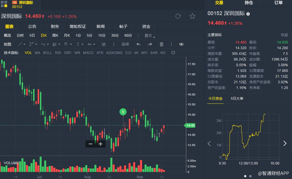 截至9月17日14:45,深圳国际涨1.26%,报14.460港元。