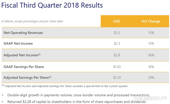 根据今年七月Visa公布的三季度财报,受惠于美国经济扩张鼓励更多人使用信用卡和借记卡,消费市场繁荣,VISA的盈利和收入好于预期,支付量、跨境交易量和已处理交易都有两位数的增长,从而推动了整体业绩增长,每股收益为1美元,同比上升16%: