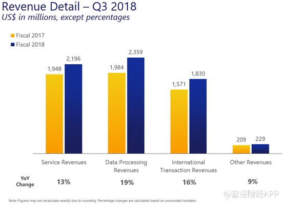 而Visa的三大核心业务——服务、数据处理和国际交易收入也都实现了稳步的增长,其中,受益于世界各地的健康经济以及电子和移动商务的推广,公司三季度服务收入21.96亿美元,同比增长13%,而美元走强则带动国际交易收入增至23.59亿美元,同比增长19%: