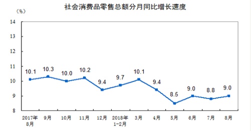 接下来看消费品行业,根据国家统计局9月14日发布的2018年1-8月份社会消费品零售情况数据,期内,全国社会消费品零售总额24.23万亿元,同比增长9.3%,其中,商品零售21.6万亿元,增长9.2%,全国网上零售额5.52万亿元,同比增长28.2%。