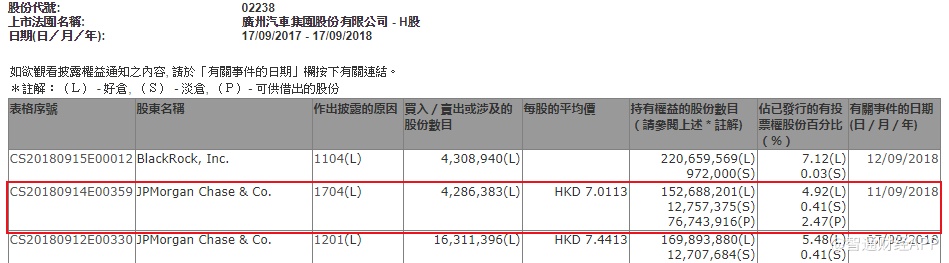 智通财经APP获悉,根据联交所资料显示,摩根大通于9月11日减持广汽集团(02238)429万股,每股作价7.01元,总值3005万元,最新持股量降至4.92%。