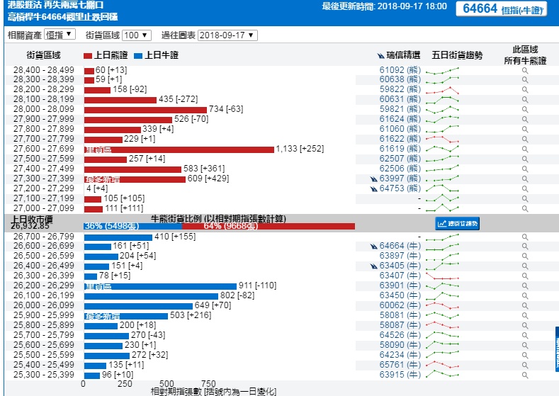 智通财经APP获悉,截至9月17日,恒指最新的牛熊街货比例为36:64。从瑞信恒指牛熊证街货分布图中得到的数据显示,熊证街货重货区在27600-27699区间,该区间熊证数量为1133张,比上一交易日增加252张;最多新增在27300-27399区间,新增429张。牛证中重货区在26200-26299区间,该区间最新牛证数量为911张,比上一交易日减少110张;最多新增在25900-25999区间,新增216张。