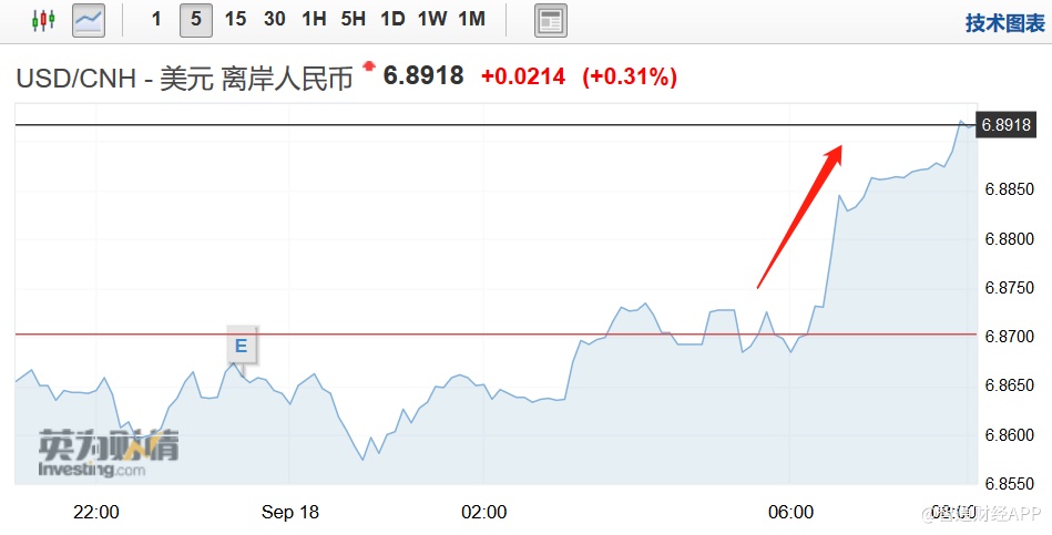 智通财经APP获悉,受贸易消息影响,离岸人民币短线下跌超200点,再次跌破6.89关口。截至发稿,离岸人民币报价6.8918,跌214点或0.31%。