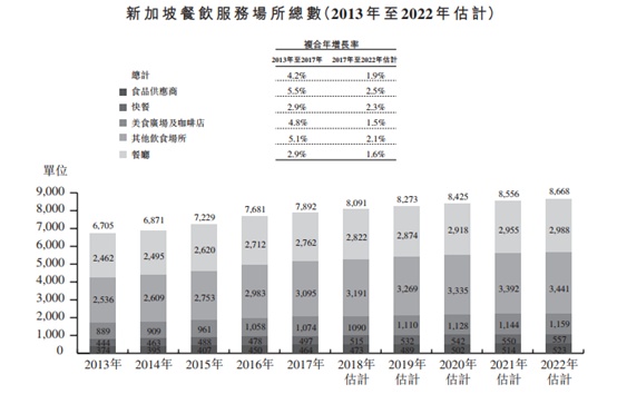 智通财经APP获悉,据K2招股书数据,新加坡餐饮服务场所总数的年复合增长率在逐年下降,由2013-2017年的4.2%降为2017-2022年预期的1.9%。且K2所处的美食广场及咖啡店领域的店铺的年复合增长率下滑空间更大,据数据,该部分市场的年复合增长率将由2013-2017年的4.8%,下滑至2017-2022年预期的1.5%。