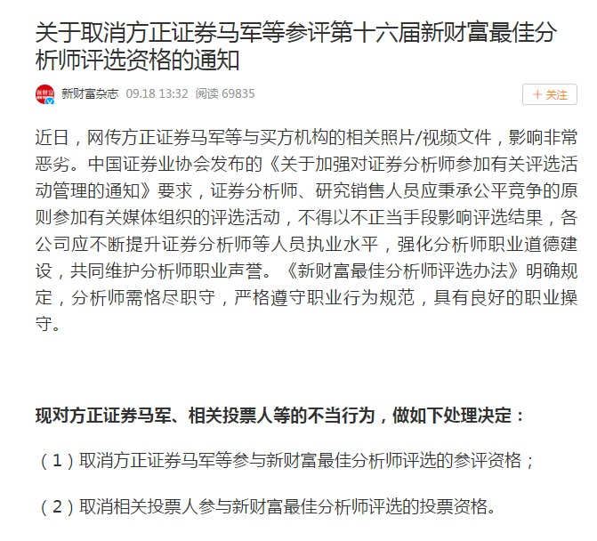 智通财经APP获悉,新财富杂志表示,将取消方正证券马军等参与新财富最佳分析师评选的参评资格,取消相关投票人参与新财富最佳分析师评选的投票资格。