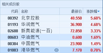智通财经APP获悉,近日内地多个地区上调天然气价格,个别燃气股造好,截至14时46分,北京控股(00392)涨5.6%,报价40.55港元,华润燃气(01193)涨4.68%,报36.9港元,新奥能源(02688)涨3.33%,报72.85港元。