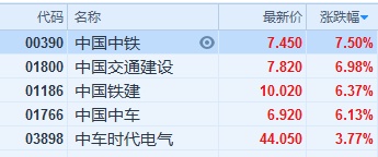 高铁基建方面,中国交通建设(01800)涨近7%、中国中铁(00390)升逾7%、中国铁建(01186)升逾6%等。