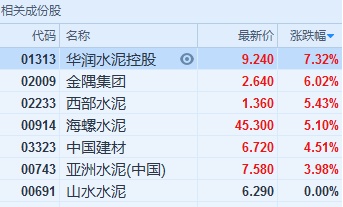 至于建材水泥方面,华润水泥(01313)涨超7%、金隅集团(02009)升逾6%、海螺水泥(00914)升5%。