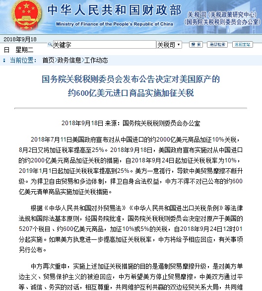根据《中华人民共和国对外贸易法》《中华人民共和国进出口关税条例》等法律法规和国际法基本原则,经国务院批准,国务院关税税则委员会决定对原产于美国的5207个税目、约600亿美元商品,加征10%或5%的关税,自2018年9月24日12时01分起实施。如果美方执意进一步提高加征关税税率,中方将给予相应回应,有关事项另行公布。
