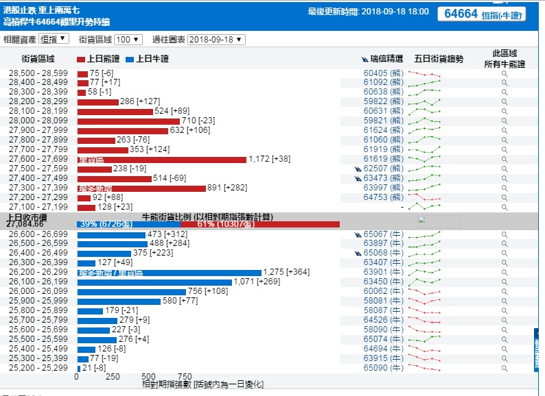 智通财经APP获悉,截至9月18日,恒指最新的牛熊街货比例为39:61。从瑞信恒指牛熊证街货分布图中得到的数据显示,熊证街货重货区在27600-27699区间,该区间熊证数量为1172张,比上一交易日增加38张;最多新增在27300-27399区间,新增282张。牛证中重货区在26200-26299区间,该区间最新牛证数量为1275张,比上一交易日增加364张;最多新增也落在这一区间。