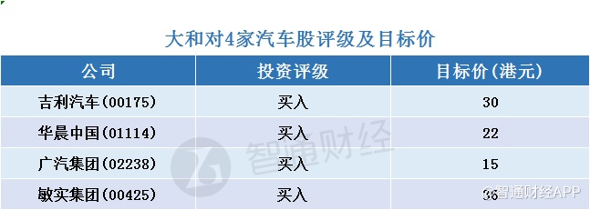 经智通财经APP整理,列大和对4家汽车股评级及目标价: