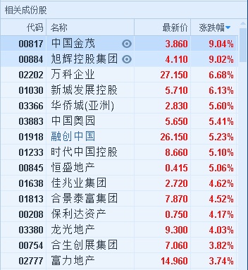 智通财经APP获悉,港股地产股随A股强势上涨,截至13时52分,中国金茂(00817)涨9.04%,报价3.86港元,旭辉控股(00884)涨9.02%,报4.11港元,万科企业(02202)涨6.68%,报27.15港元,融创中国(01918)涨5.23%,报26.15港元,佳兆业(01638)涨4.62%,报2.72港元。